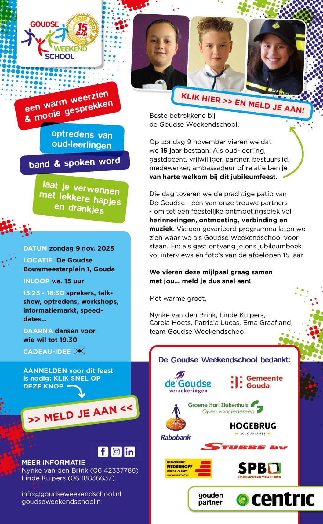 Op de Goudse Weekendschool ontdekken jongeren vanaf 10 jaar uit alle wijken van Gouda de wereld. Dat is goed voor hun algemene ontwikkeling, taalvaardigheid en zelfvertrouwen. Ook leren de kinderen beter samenwerken, communiceren en presenteren. Meedoen aan de Goudse Weekendschool is GOUD voor hun toekomst!