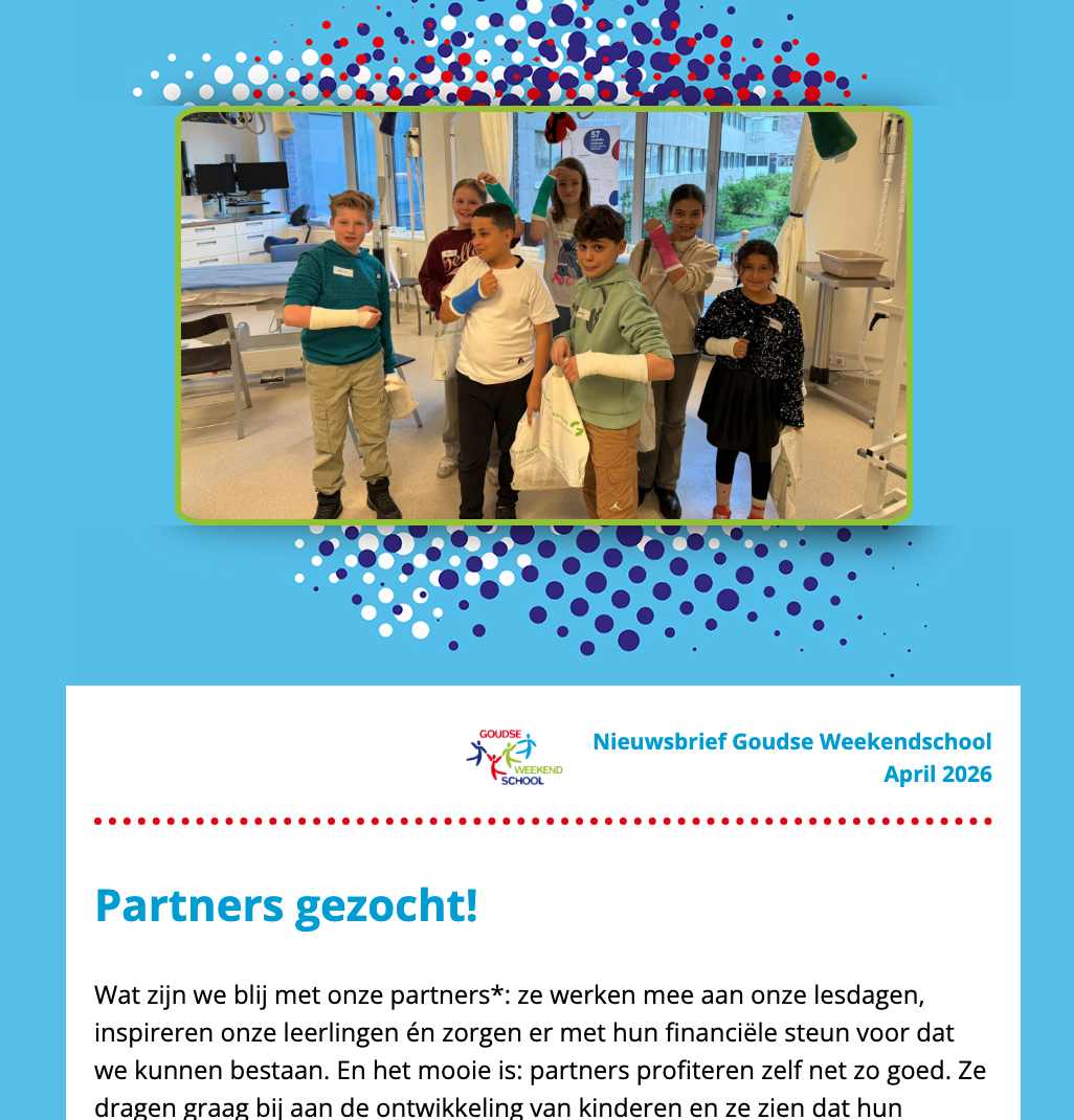 Op de Goudse Weekendschool ontdekken jongeren vanaf 10 jaar uit alle wijken van Gouda via beroepen de wereld. Dat is goed voor hun algemene ontwikkeling, taalvaardigheid en zelfvertrouwen. Ook leren de kinderen beter samenwerken, communiceren en presenteren. Meedoen aan de Goudse Weekendschool is GOUD voor hun toekomst!